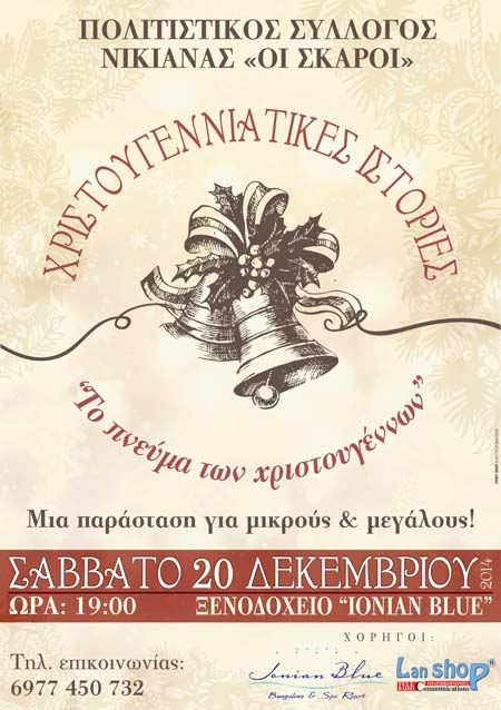 Το Σάββατο 20/12 στις 19:00 στο ξενοδοχείο Ionian Blue στην Νικιάνα, το παιδικό θεατρικό τμήμα του συλλόγου μας θα παρουσιάσει το έργο "Χριστουγεννιάτικες Ιστορίες: Το Πνεύμα των Χριστουγέννων" σε σκηνοθεσία Θεόδωρου Κωστόπουλου.