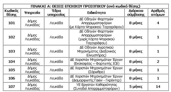 Την πρόσληψη, με σύμβαση εργασίας ιδιωτικού δικαίου ορισμένου χρόνου, συνολικά είκοσι τεσσάρων (24) ατόμων για την κάλυψη εποχικών ή παροδικών αναγκών του Δήμου Λευκάδας.