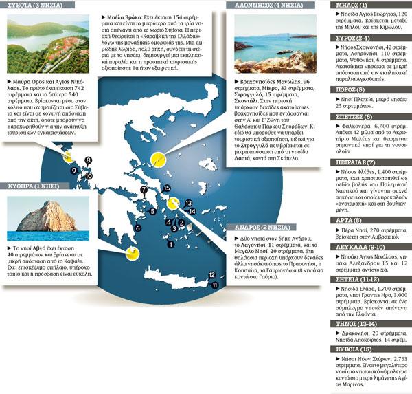 Η λίστα με τα 25 από τα συνολικά 40 νησιά που θα ενοικιαστούν σε ιδιώτες είναι η εξής: