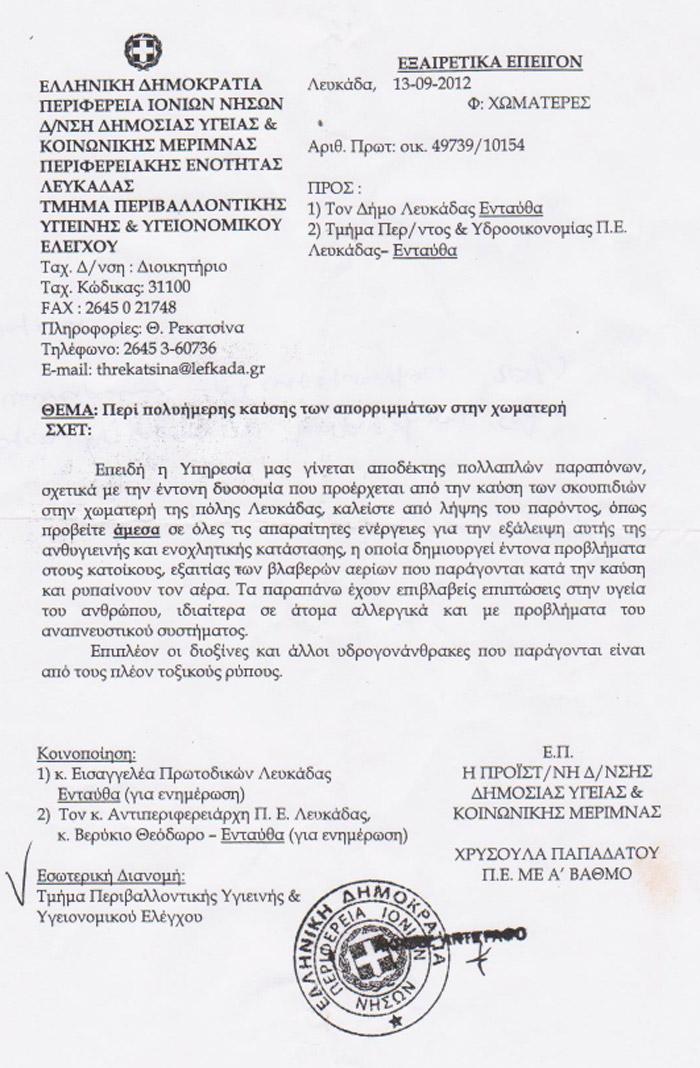 Σύμφωνα με το ρεπορτάζ η Προϊσταμένη Διεύθυνσης Δημόσιας Υγείας & Κοινωνικής Μέριμνας της Περιφέρειας Ιονίων Νήσων κα Χρυσούλα Παπαδάτου με έγγραφο της 13.09.2012 προς το Δήμο Λευκάδας και το Τμήμα Περ/ντος &Υδροοικονομίας Π.Ε. Λευκάδας με την ένδειξη εξαιρετικά επείγον, δίνει εντολή «επειδή η υπηρεσία μας γίνεται αποδέκτης πολλαπλών παραπόνων, σχετικά με την έντονη δυσοσμία που προέρχεται από την καύση των σκουπιδιών στη χωματερή της Λευκάδας, καλείστε από λήψης του παρόντος, όπως προβείτε άμεσα σε όλες τις απαραίτητες ενέργειες για την εξάλειψη αυτής την ανθυγιεινής και ενοχλητικής κατάστασης, η οποία δημιουργεί έντονα προβλήματα στους κατοίκους, εξαιτίας των βλαβερών αερίων που παράγονται κατά την καύση και ρυπαίνουν τον αέρα. Τα παραπάνω έχουν επιβλαβείς επιπτώσεις στην υγεία του ανθρώπου, ιδιαίτερα σε άτομα αλλεργικά και με προβλήματα του αναπνευστικού συστήματος. Επιπλέον οι διοξίνες και άλλοι υδρογονάνθρακες που παράγονται είναι από τους πλέον τοξικούς ρύπους.»