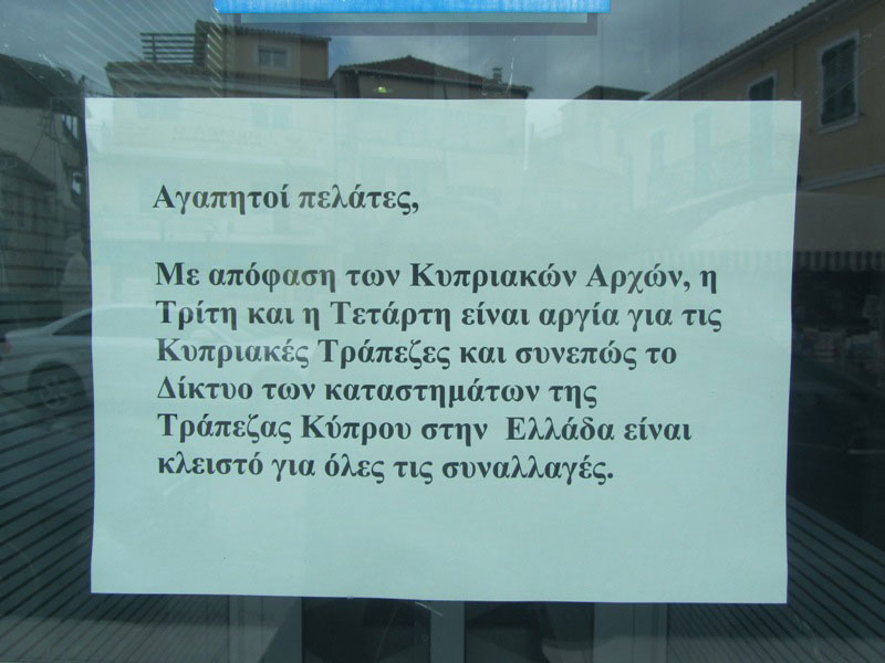 Και τοπικά βέβαια οι Λευκαδίτες πολίτες που έχουν καταθέσεις στις συγκεκριμένες τράπεζες αναρωτιούνται τι θα γίνει τώρα με τα χρήματα τους, υπάρχει αγωνία και τρόμος για τα όσα ακούγονται. Σε 2 μέρες θα γνωρίζουμε περισσότερα. Στις συγκεκριμένες 2 τράπεζες στην Λευκάδα, Κύπρου και Λαϊκή Τράπεζα οι κατάθετες ενημερώνονται από ένα χαρτί που έχει κολληθεί στην πόρτα των καταστημάτων για την υπάρχουσα κατάσταση. Τα ΑΤΜ μέχρι στιγμής δουλεύουν κανονικά, ούτε ουρές παρατηρήσαμε μπροστά από τα καταστήματα.