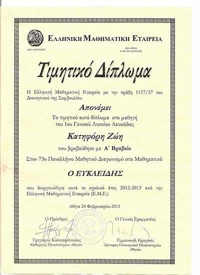 Συγχαρητήρια στον Ζώη Κατηφόρη για το 1ο βραβείο μαθηματικών.