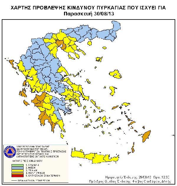 Σύμφωνα με το Χάρτη Πρόβλεψης Κινδύνου Πυρκαγιάς που εκδίδει η Γενική Γραμματεία Πολιτικής Προστασίας του Υπουργείου Δημόσιας Τάξης και Προστασίας του Πολίτη (www.civilprotection.gr) για σήμερα Πέμπτη 29 Αυγούστου 2013, προβλέπεται υψηλός κίνδυνος πυρκαγιάς (κατηγορία κινδύνου 3) για τις Περιφερειακές Ενότητες της Περιφέρειας Ιονίων Νήσων: Λευκάδας, Κεφαλλονιάς, Ιθάκης και Ζακύνθου