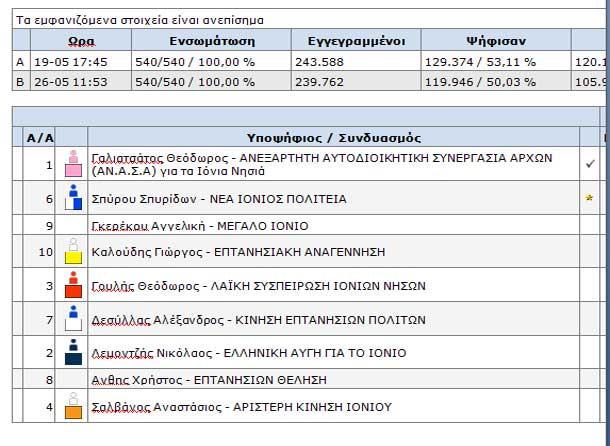 Χθες το Υπουργείο Εσωτερικών ανήρτησε στην επίσημη σελίδα των αποτελεσμάτων του τα εξής για τα αποτελέσματα στη Περιφέρεια Ιονίων Νήσων: