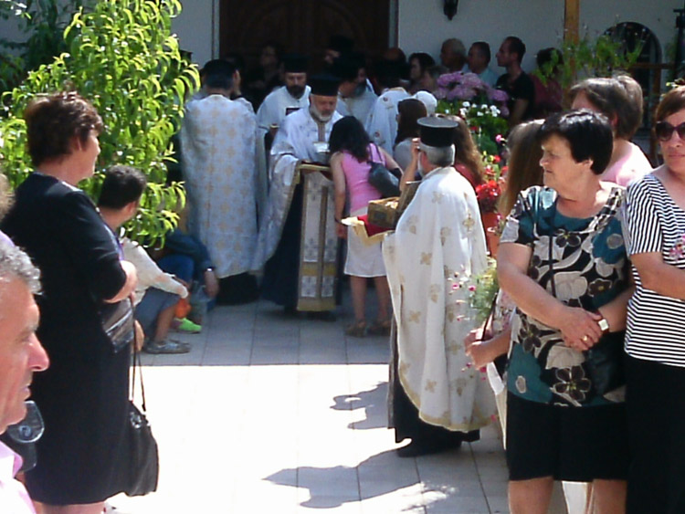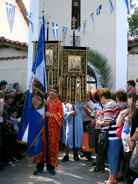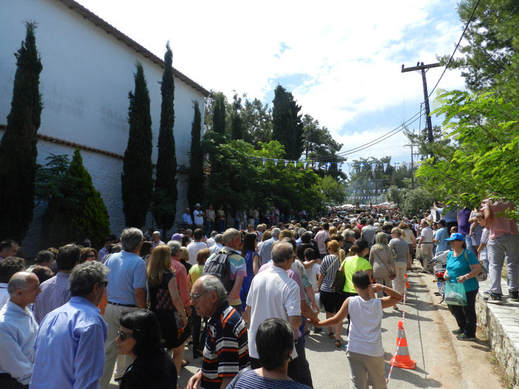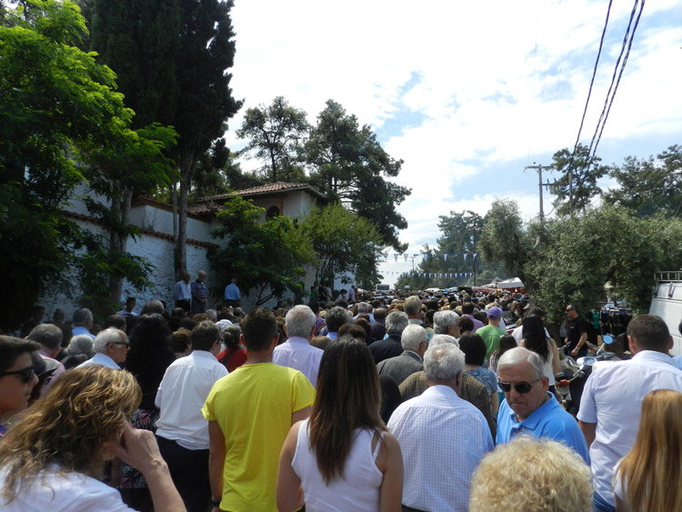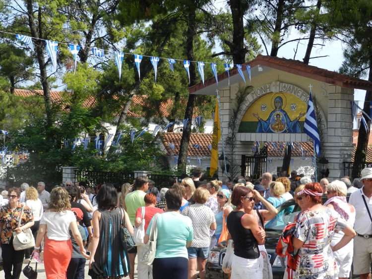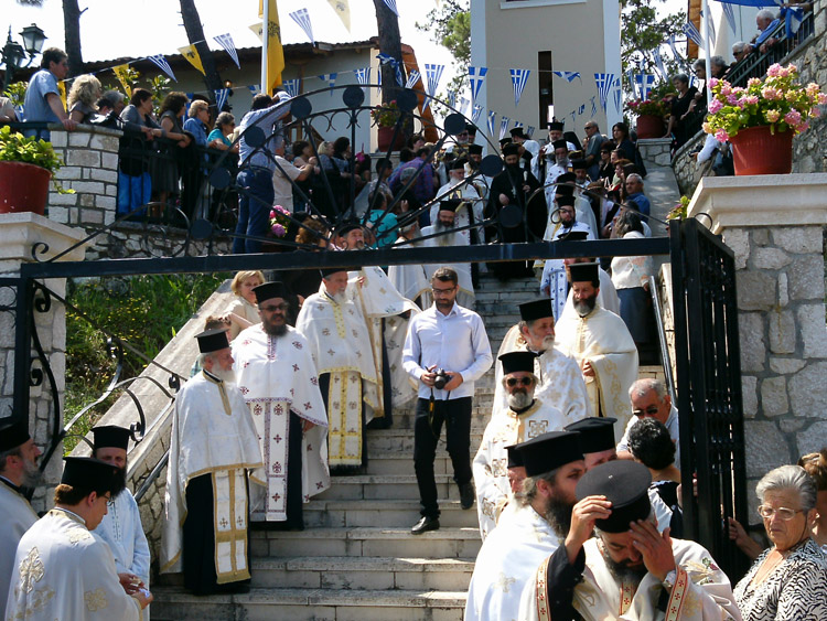 Μετά τη λήξη της πρωινής Πανηγυρικής Πολυαρχιερατικής Θείας Λειτουργίας, που έλαβε χώρα στην ιερά μονή της προστάτιδας του νησιού, Αγίας Φανερωμένης, την οποία παρακολούθησε πλήθος πιστών από όλη την Ελλάδα, ακολούθησε η καθιερωμένη περιφορά της θαυματουργής εικόνας της Παναγίας, έξω από το μοναστήρι.