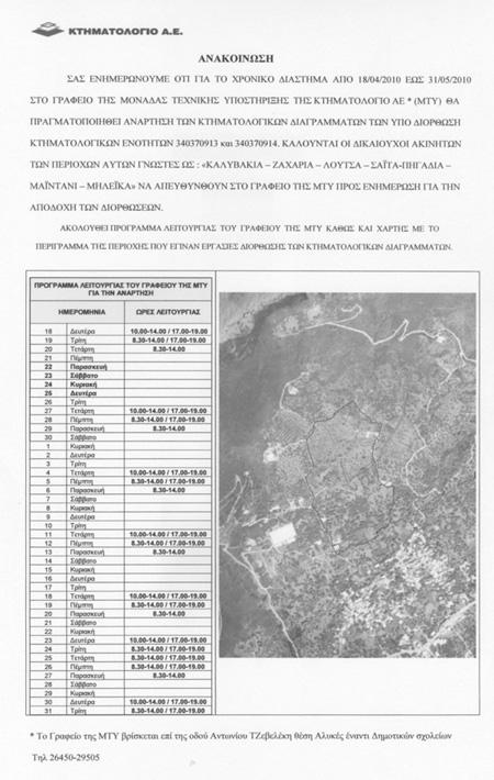 Σε συνέχεια της από 13/4/2011 ενημέρωσή μας από την εταιρεία Κτηματολόγιο ΑΕ, σχετικά με την επικείμενη ανάρτηση των κτηματολογικών στοιχείων των υπό διόρθωση κτηματολογικών ενοτήτων 340370913 – 340370914 στην Τοπική Κοινότητα Τσουκαλάδων, σας αποστέλλουμε την σχετική ανακοίνωση για την ενημέρωση των ενδιαφερομένων.
