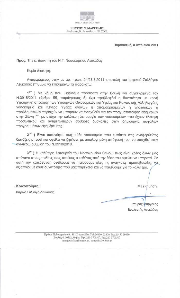 Σχετικές για το θέμα είναι και οι από 8/4/2011 και 11/4/2011 επιστολές του βουλευτή Σπύρου Μαργέλη και της Διοικήτριας του Νοσοκομείου τις οποίες και επισυνάπτουμε.