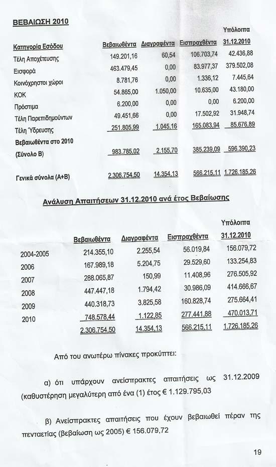 Ο Δήμαρχος παρουσίασε στη συνέχεια την 19 η σελίδα της έκθεσης ελέγχου, σύμφωνα με την οποία, όπως είπε φαίνεται «το νοικοκύρεμα» του Δήμου και η κατάρρευση.