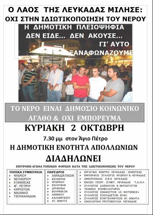 Εμείς που υπογράφουμε αυτό το κείμενο εκφράζουμε την αντίθεσή μας στην απόφαση της πλειοψηφίας του Δημοτικού Συμβουλίου Λευκάδας να παραδώσει την ύδρευση και αποχέτευση στην Ε.Υ.Δ.Α.Π. Α.Ε. για τα επόμενα 20 χρόνια και μάλιστα με απεχθείς όρους και αποικιακή σύμβαση.