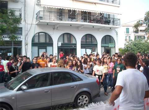 Οι μαθητές φωνάζοντας συνθήματα, « Μας κυβερνά η Τρόικα, το ΔΝΤ και τα λεφτά, την παιδεία ποιος την θυμάται τώρα κοιμάται μια χαρά» , κ.α. και κρατώντας πανό στα χεριά, διαμαρτύρονται ηχηρά για τις περικοπές που γίνονται σε βάρος την παιδείας, όπως η έλλειψη βιβλίων και καθηγητών.