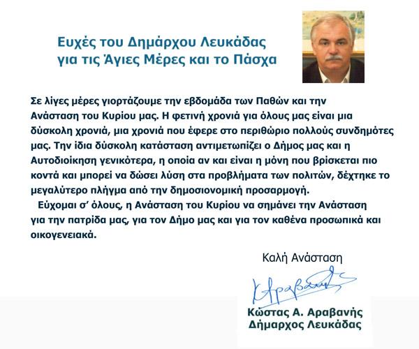 Ευχές του Δημάρχου Λευκάδας για τις Άγιες Μέρες και το Πάσχα