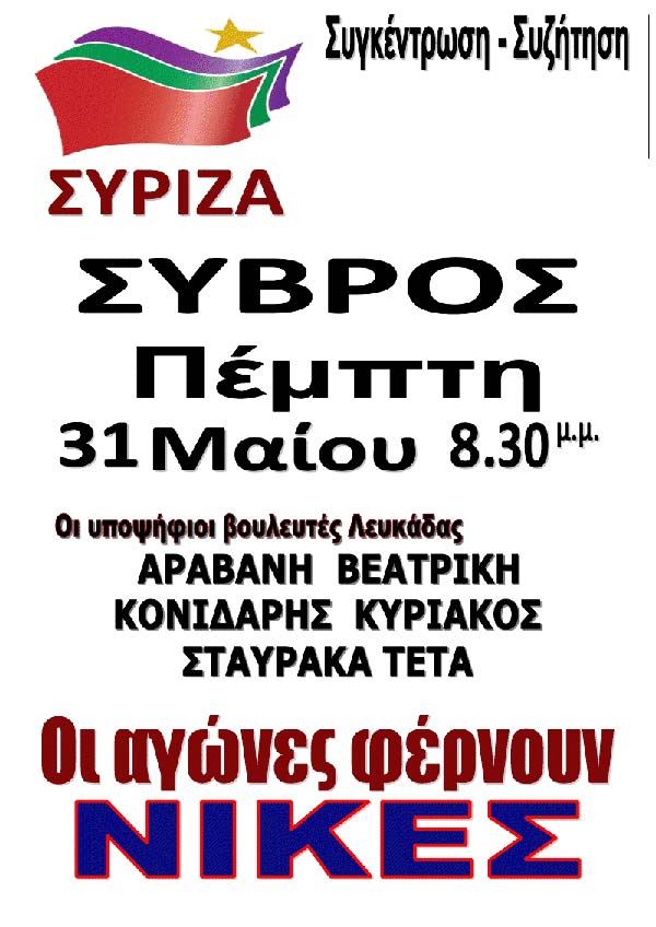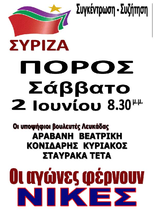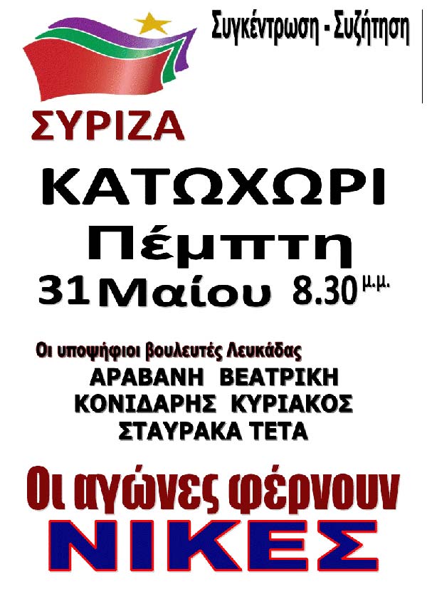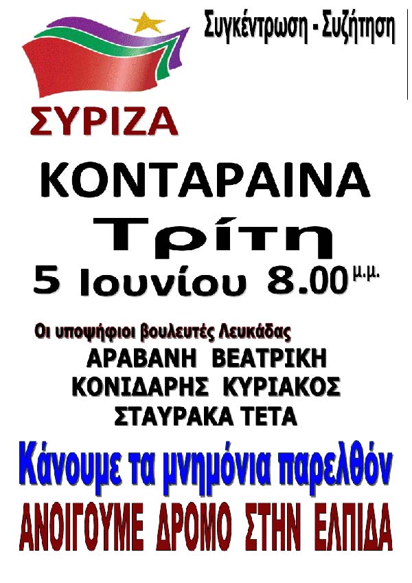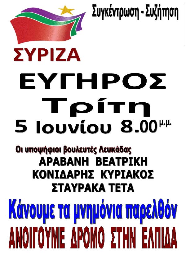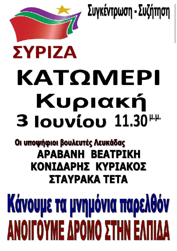 Το πρόγραμμα περιοδειών κλιμακίου του ΣΥΡΙΖΑ - ΕΚΜ την Παρασκευή 1η Ιουνίου,έχεις ως εξής :περιοδεία σε ΚΟΜΗΛΙΟ - ΔΡΑΓΑΝΟ - ΑΘΑΝΙ - ΝΙΚΟΛΗ - ΜΑΝΑΣΗ - ΧΟΡΤΑΤΑ - ΕΞΑΝΘΕΙΑ - ΔΡΥΜΩΝΑ - ΑΓ. ΝΙΚΗΤΑ. Δευτέρα 4 Ιουνίου 2012 οι υποψήφιοι βουλευτές Λευκάδας με το ψηφοδέλτιο του ΣΥΡΙΖΑ ΕΝΩΤΙΚΟ ΚΟΙΝΩΝΙΚΟ ΜΕΤΩΠΟ, Βεατρίκη Αραβανή, Κυριάκος Κονιδάρης και Τέτα Σταύρακα, θα επισκεφθούν ΚΑΛΑΜΟ και ΚΑΣΤΟ για να συζητήσουν με τους πολίτες ενόψει των κρίσιμων εκλογών της 17ης Ιουνίου.